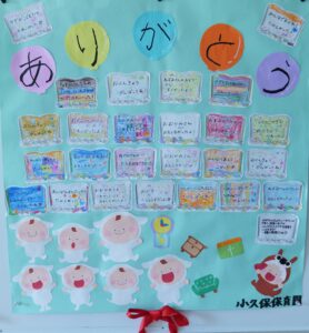 子どもたちの感想をたくさん貼り付けた素敵なポスターは、保育者の先生が短大まで足を運んで届けてくださいました。ありがとうございました。