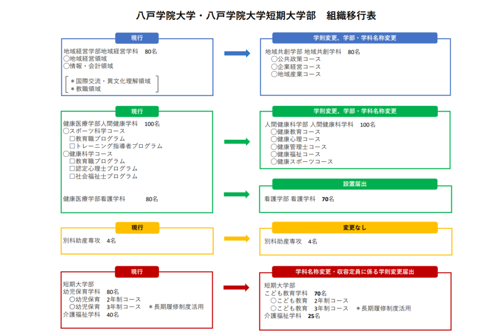 八戸学院大学短期大学部では、幼児保育学科の学科名称ならびに2学科の入学定員を変更します。令和8年4月1日から、以下のとおりとなります。